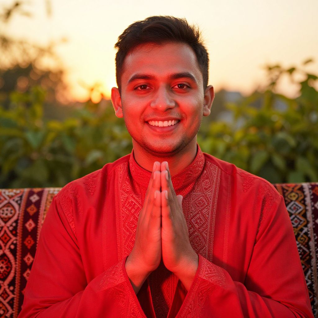 Intimate portrait of a beaming man, dressed in vibrant traditional garb, hands clasped together in gratitude, eyes aglow with joy, set against a warm, golden hour backdrop, illuminated by soft, crimson hues, as he celebrates the festive occasion of Eid al-Fitr, surrounded by lush greenery and ornate patterns. Man has masculine face and piercing eyes