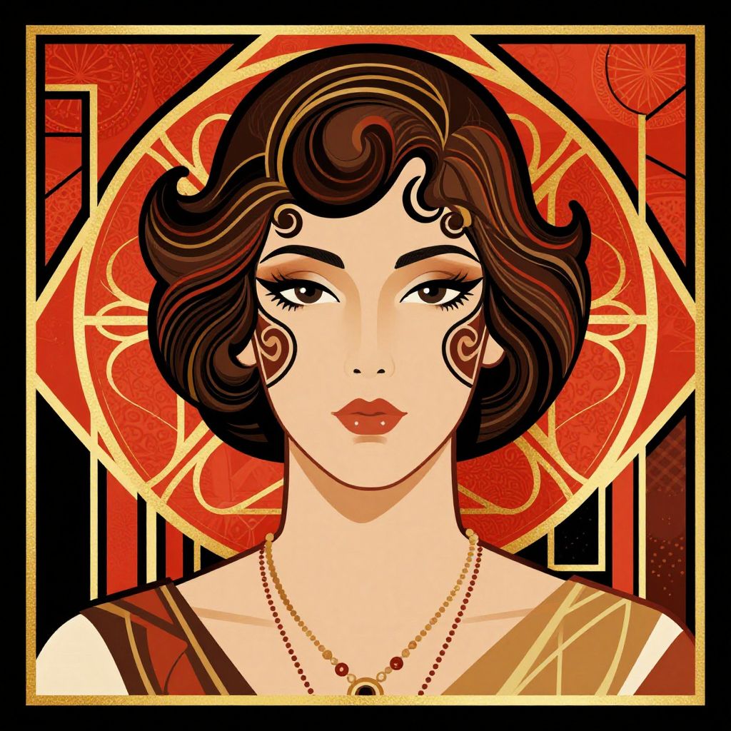 This is a digital drawing in a vintage Art Deco style. It features a young woman with fair skin, large brown eyes, and full red lips. She has short, wavy brown hair with curl patterns accentuated by black and gold lines. She wears a gold necklace with a small pendant and a brown and gold striped garment. Her face is centered in the image, with a large, red, circular Art Deco pattern in the background, framed by black and gold geometric designs. The overall color palette includes red, black, gold, and brown, with a strong contrast between the bold background and the woman's delicate features.