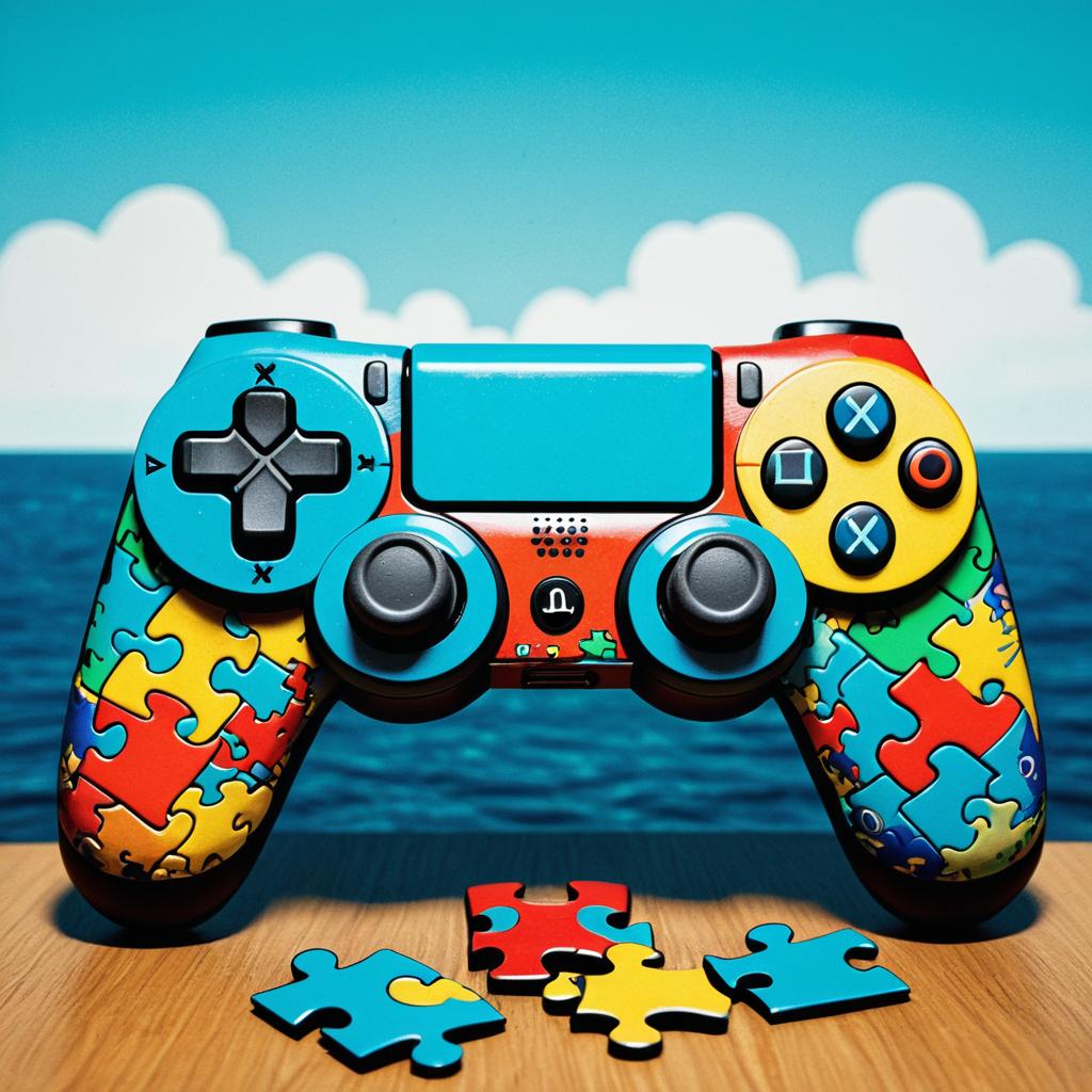A colorful video game controller made of puzzle pieces, ocean conservation, styled in a playful and whimsical way.