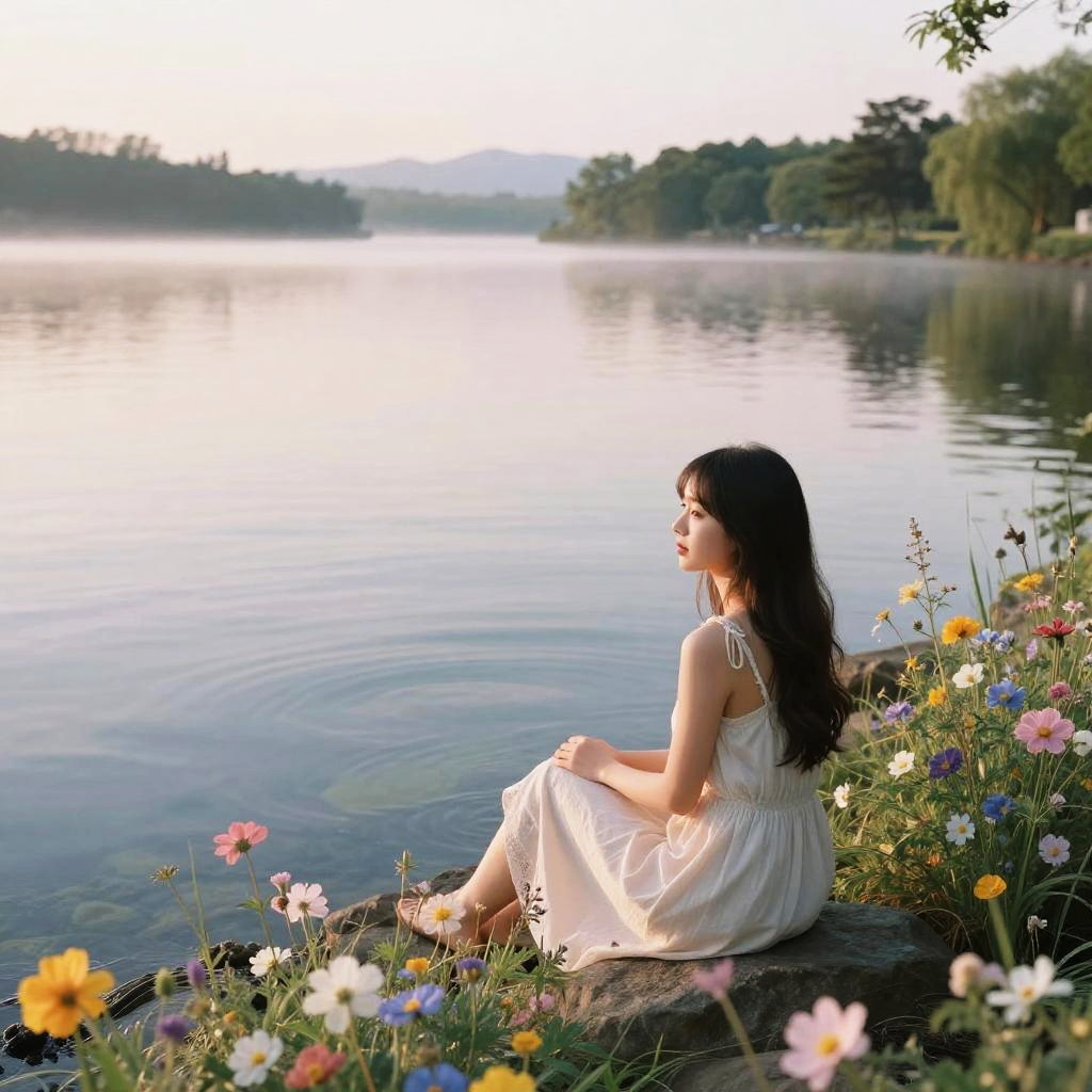 A serene scene of Tamlyn sitting beside a crystal-clear lake at dawn, surrounded by blooming wildflowers, soft pastel colors, gentle light reflections on the water, tranquil and dreamy mood, detailed natural background