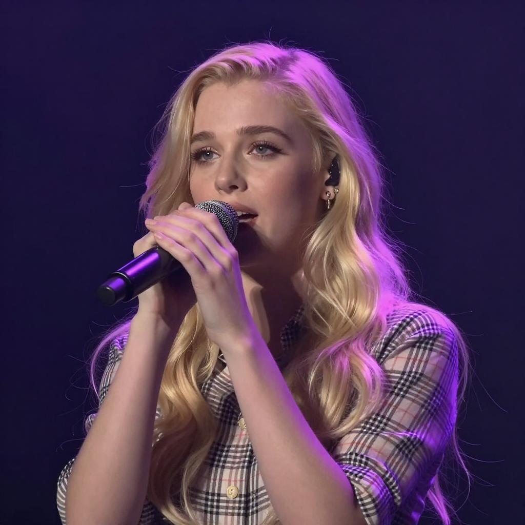 Photograph of a blonde woman with wavy hair, wearing a purple off-shoulder jacket and a patterned top, passionately singing into a black microphone. She has a joyful expression, eyes closed, and her right hand is raised. The background is a soft blue gradient.