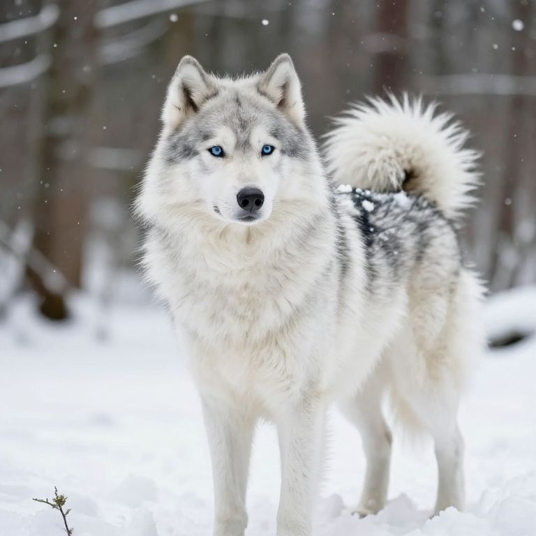 Photograph of a striking Siberian Husky standing in a snowy forest. The dog has a thick, fluffy coat with a mix of gray, white, and black fur, and piercing blue eyes. Its tail is curled upwards. Snow covers the ground and the background features blurred, snow-covered trees. The Husky's fur looks soft and well-groomed, with a slightly bushy texture. The dog stands confidently, looking directly at the camera, with a calm and alert expression. The image has a bright, crisp quality, emphasizing the white snow and the dog's fur against the darker tree trunks.