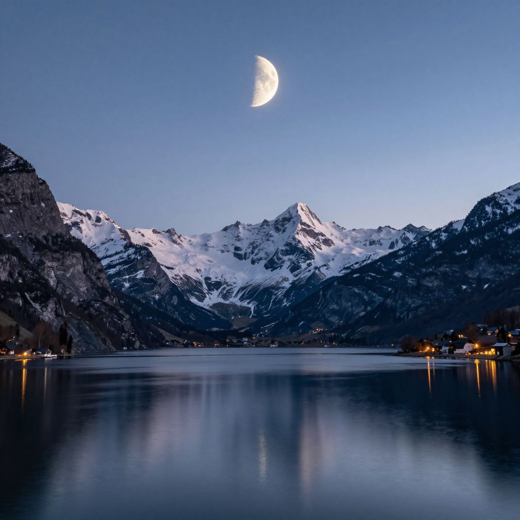 Photograph of a serene mountain lake at twilight with a crescent moon shining brightly in the clear blue sky. Snow-capped mountains frame the background, reflecting in the calm, mirror-like water below. The lake is dotted with small, warmly lit buildings on the right, creating a tranquil, almost magical atmosphere. The mountains have rugged, dark gray and white textures, contrasting with the smooth, reflective surface of the lake. The overall color palette includes deep blues, whites, and warm yellow lights, evoking a peaceful, wintry night.