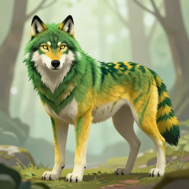 Digital artwork of a vibrant, fantasy wolf standing in a misty forest. The wolf has striking yellow and green fur with black stripes and white accents on its chest and paws. Its yellow eyes are piercing and alert, and its black-tipped ears are perked up. The background is a softly blurred forest with tall trees and a light green, ethereal glow. The wolf's fur is detailed with a mix of smooth and fluffy textures, giving it a realistic yet fantastical appearance. The forest floor is covered in grass and small rocks.