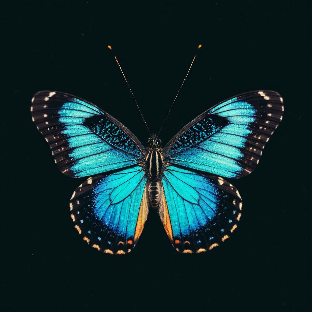 Ultra-realistic macro photograph of a butterfly with iridescent blue wings, featuring intricate patterns and dark edging. The butterfly is facing the viewer against a dark background, emphasizing its vivid coloration and fine details with a film grain effect.