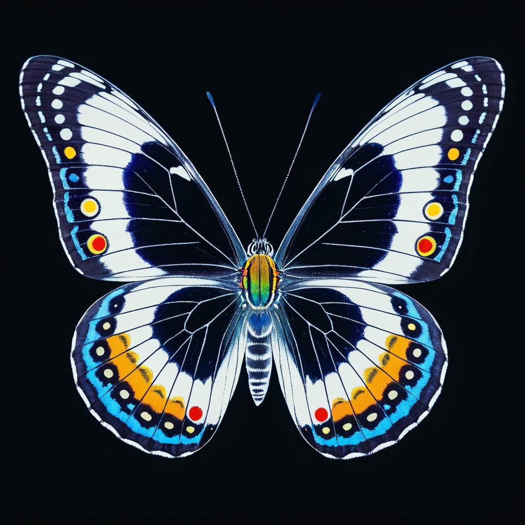 Macro shot, cinematic photo of butterfly, iridescent colors, dark shot, film grain, (((facing viewer))), ultra-realistic, 64 bits pixel art