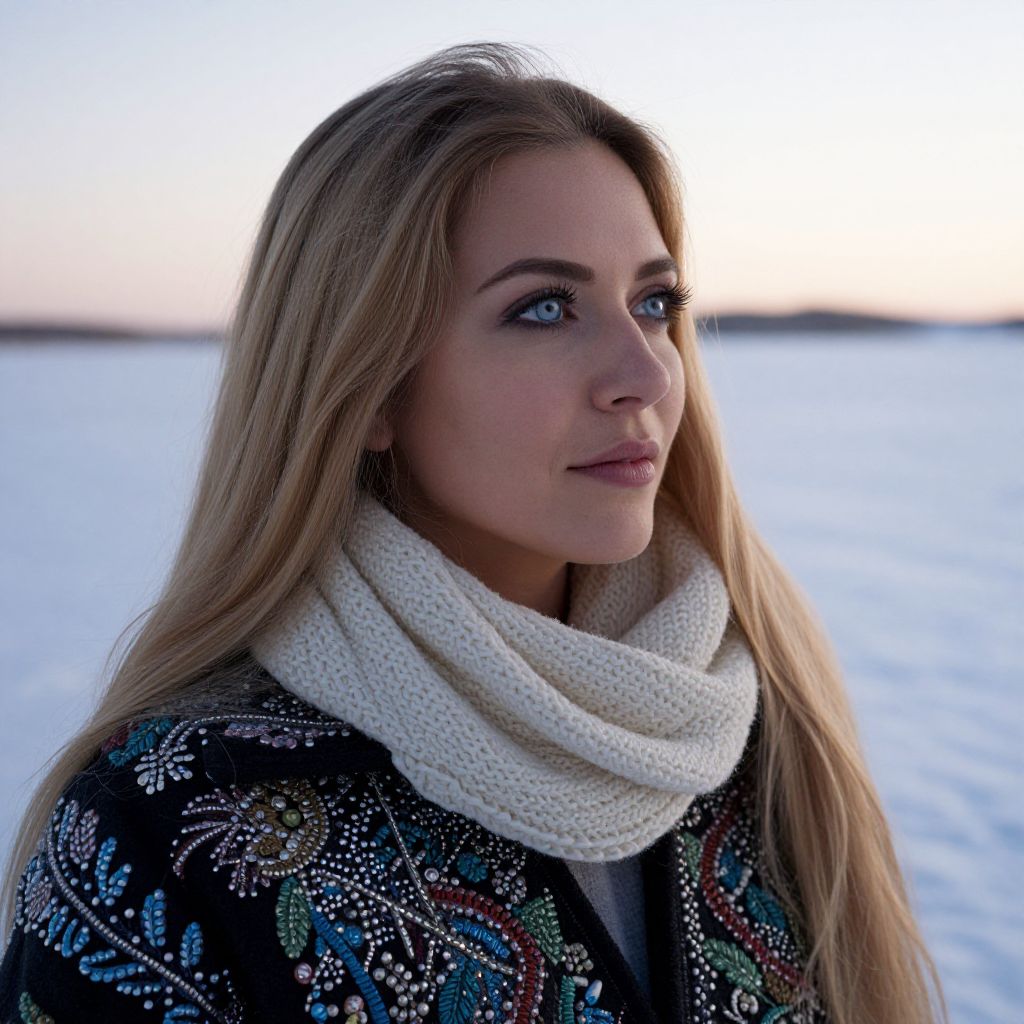 Imagine a DSLR portrait of a Hispanic woman with icy blue eyes and golden-blonde hair cascading down her back, illuminated by soft, snowy dawn light. From an unusual high angle, we see her serene expression as she gazes thoughtfully towards the horizon. Her delicate features evoke tranquility and introspection. The intricate details of her hand-knitted scarf and embroidered coat, adorned with shimmering threads that catch the light, further emphasize her individuality against a vast, pristine landscape. This captivating visual narrative blends fine art photography and impressionist aesthetics.