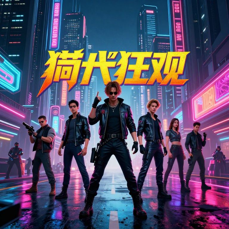 Create your own movie poster with a futuristic cityscape, neon lights reflecting on wet streets, a group of diverse characters in action poses, bold typography in the center, cyberpunk aesthetic, high contrast shadows, detailed textures, epic atmosphere.