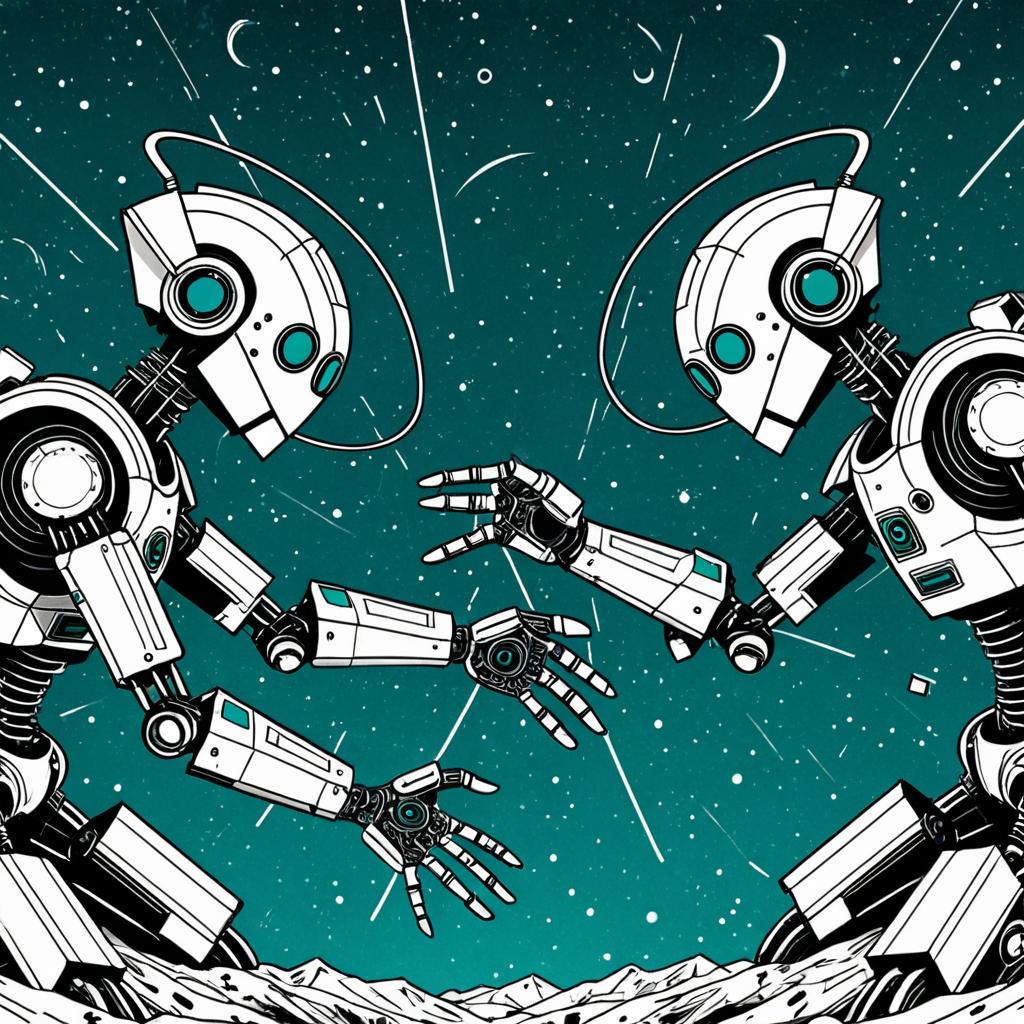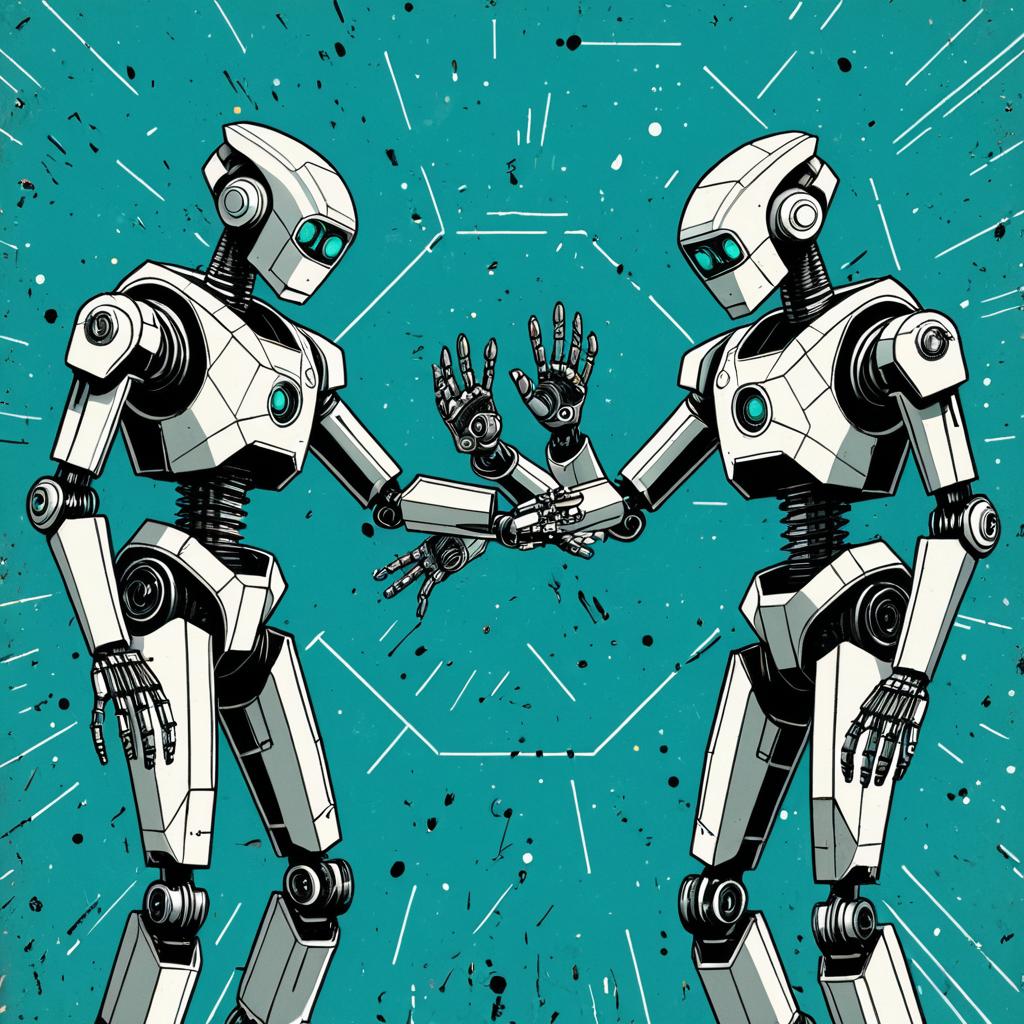 Detailed digital illustration of two futuristic silver and teal robots facing each other with their hands reaching out. The mechanical figures feature geometric design elements and intricate mechanical joints, set against a teal background with sketch-style distress and noise effects.