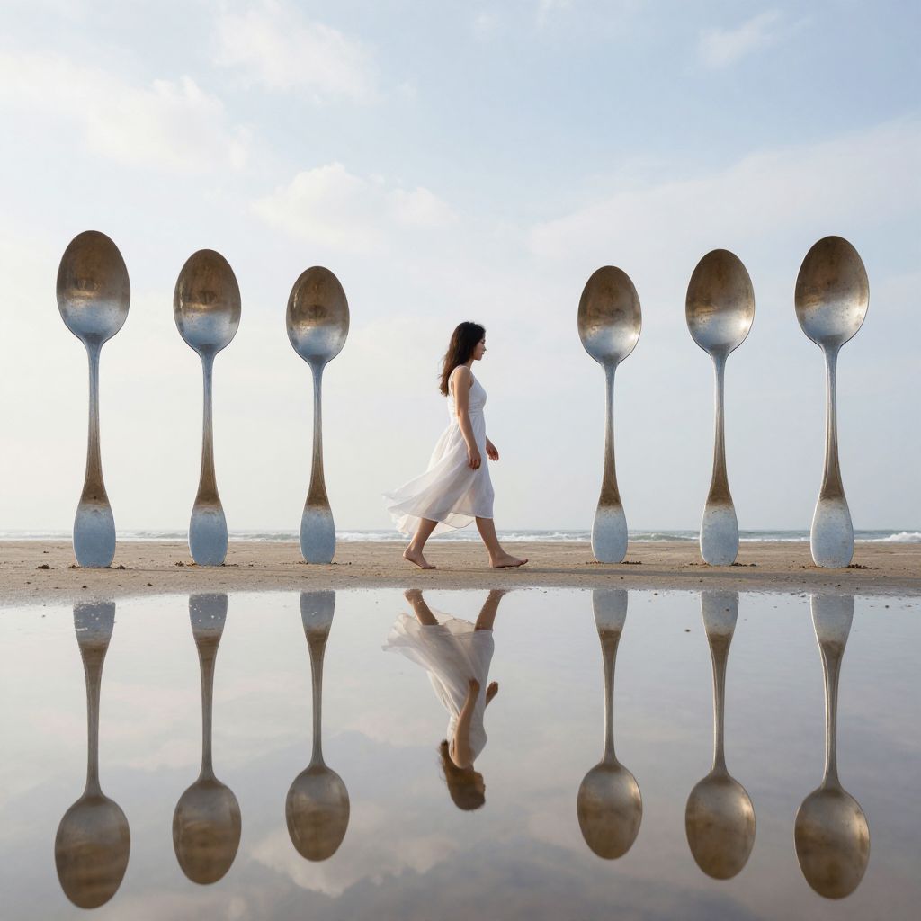 Woman walking along a reflective beach, her flowing white dress mirroring the sky as eight oversized spoons stand upright in the sand, their reflections shimmering in the water below.
