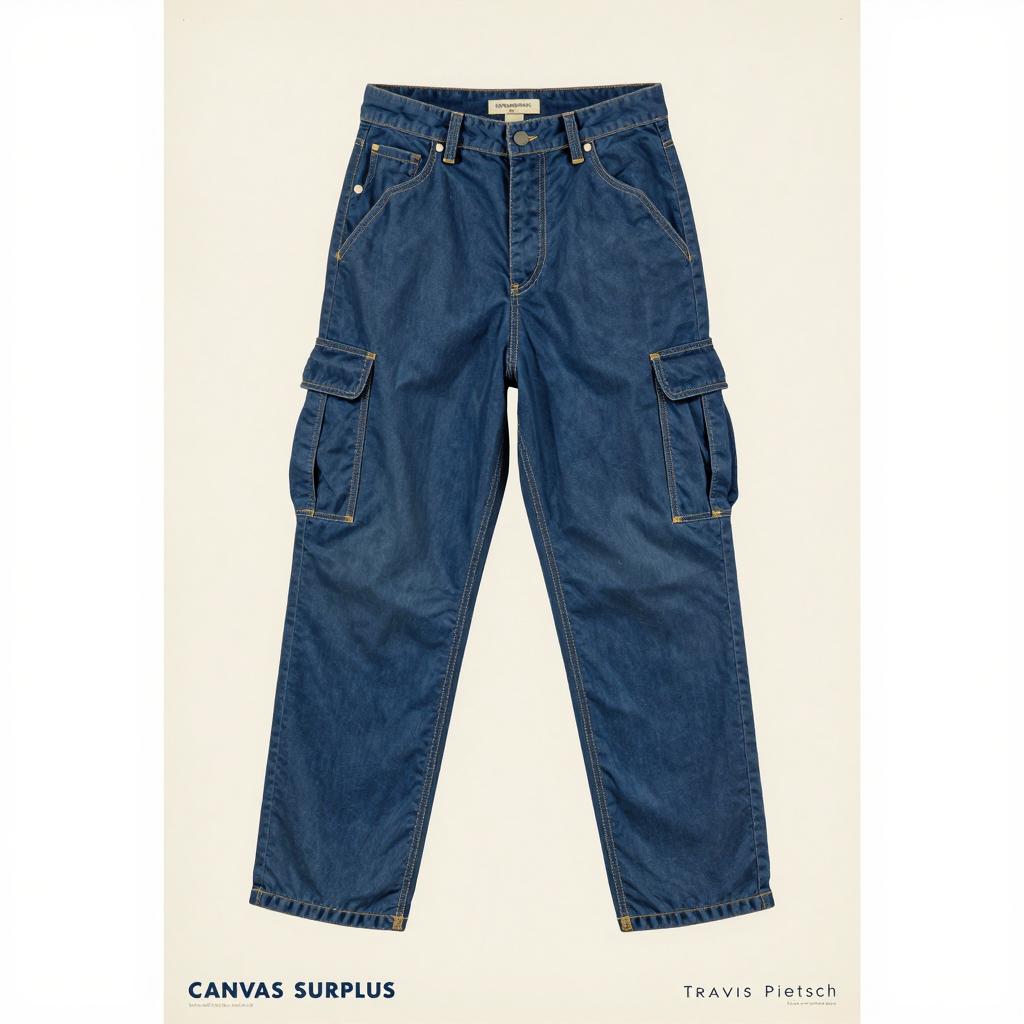 Otaku a retro poster design of Canvas Surplus Cargo Trouser, in the style of Travis Pietsch, deep blue, american 1920s workwear style, heavy-duty materials, retro, vintage, nostalgic, tempera, faded colors,
