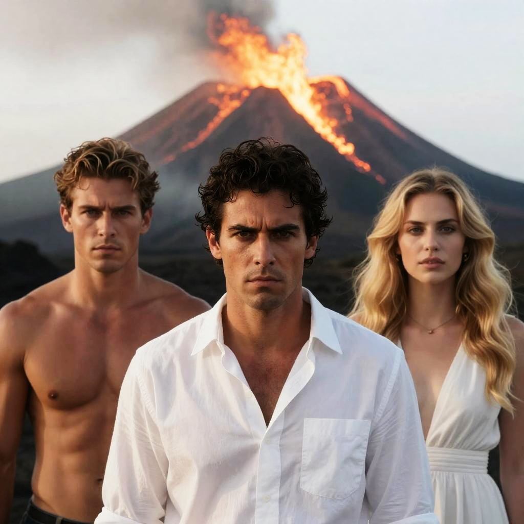 Photograph of six smiling people on a tropical beach. Central male with long hair, sunglasses, white shirt, and necklace. Surrounding him: blonde woman in red dress, woman in plaid bikini, man in patterned shirt, man in purple shirt, and woman with wavy hair. Large wooden ship wheel in foreground. Palm trees and blue ocean in background. All people have arms around each other. Bright sunlight.