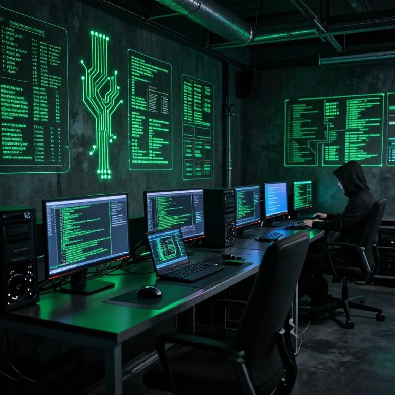 Computer hacker room setup, underground hideout with walls covered in circuit diagrams and data charts, multiple laptops and servers running, green code flowing on displays, moody cyber atmosphere