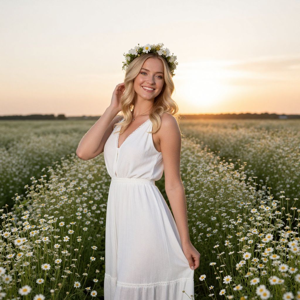 Photograph of a smiling blonde woman standing in a sunlit field of white daisies at sunset. She wears a white, sleeveless, V-neck dress with a waistband and layered, sheer fabric. A black floral crown adorns her head. Her long, wavy hair cascades over her shoulders. She holds the hem of her dress slightly to the side. The background shows an expansive, green field with a horizon of distant trees under a pink and orange sky. The sunlight creates a warm, golden glow around her, enhancing the serene and natural atmosphere.