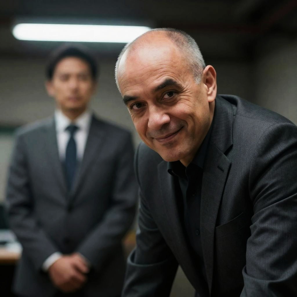 Middle-aged man with balding head and gray beard, wearing black jacket and dark shirt, sitting at a dimly lit restaurant table. Hands raised in a gesturing motion, smiling slightly. Table has glass, candle, saltshaker, and glass bottle. Background is blurred with soft lights.