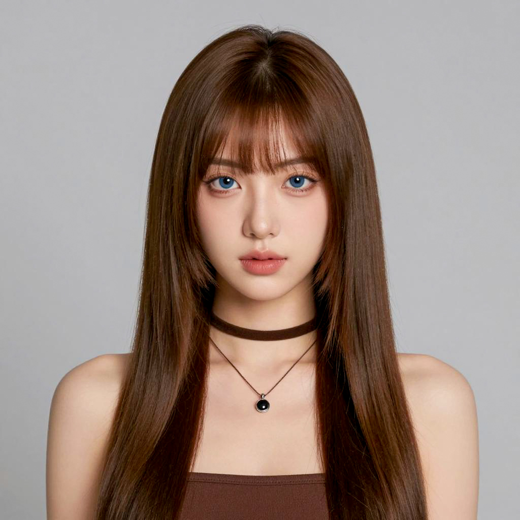 Clip bangs hair extensions, digital portrait of a young woman with straight brown hair, bangs, blue eyes, wearing a strapless brown top, brown choker, and a necklace with a small pendant, neutral gray background, realistic style, close-up, soft lighting, detailed facial features, smooth skin, subtle makeup, center frame, studio photograph feel, no visible background objects