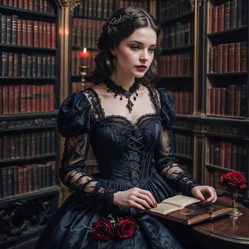 Photo of a delicate woman, Wavy Lob, gothic romance outfit, black indigo lace dress, Organza corset, dark red roses, silver jewelry, Victorian style, Mary Jane Flats, dramatic makeup, moody, elegant, mysterious, candlelit Library, Dark Romanticism