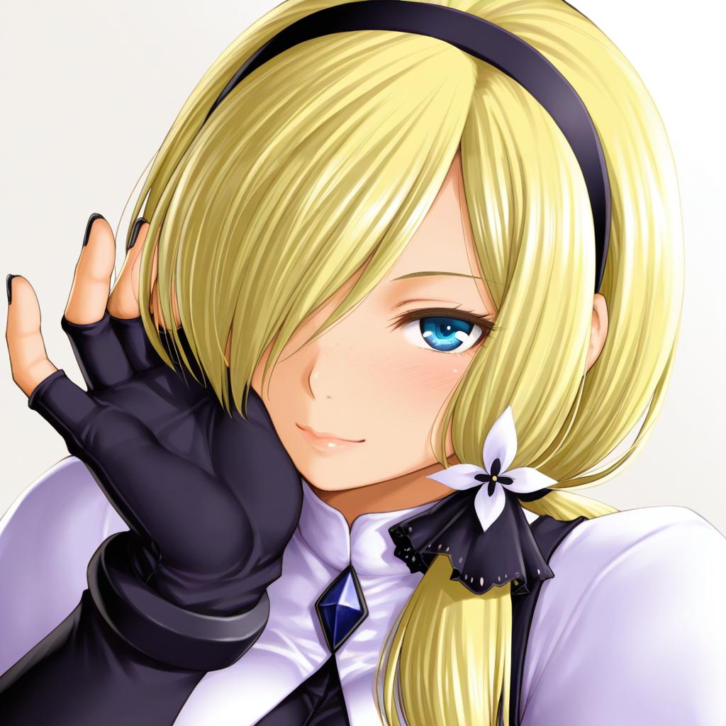Ash crimson, the king of fighters, 1boy, blue eyes, hair over one eye, blonde hair, hairband, freckles, fingerless gloves, nail polish, black nails, by artist kasuga yukihito, illustrious