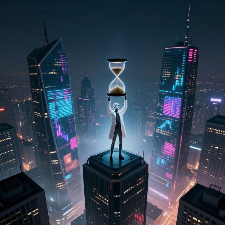 Imagine a digital art piece that blends surrealism with cyberpunk aesthetics. In this scene, a cityscape of towering skyscrapers and flickering holographic advertisements forms the backdrop against the night sky. The focal point is an old-world grandfather clock transformed into abstract, melded forms resembling both machinery and organic structures. From within these warped contours, a figure emerges – a fusion of human and machine elements – clutching an illuminated hourglass close to their heart. This enigmatic silhouette casts its shadow over the city, evoking feelings of nostalgia for past eras and anticipation for what lies ahead in this intricate dance between time and technology.