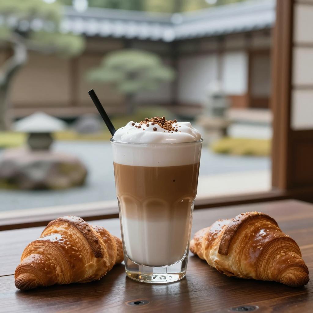 Woman holding croissant in front of face, wearing white fur-trimmed coat, black nail polish, silver ring, paper with gold design in hand, street background with historic buildings, daytime, close-up shot.