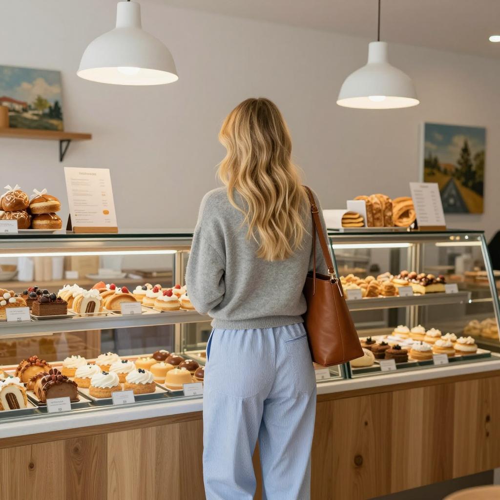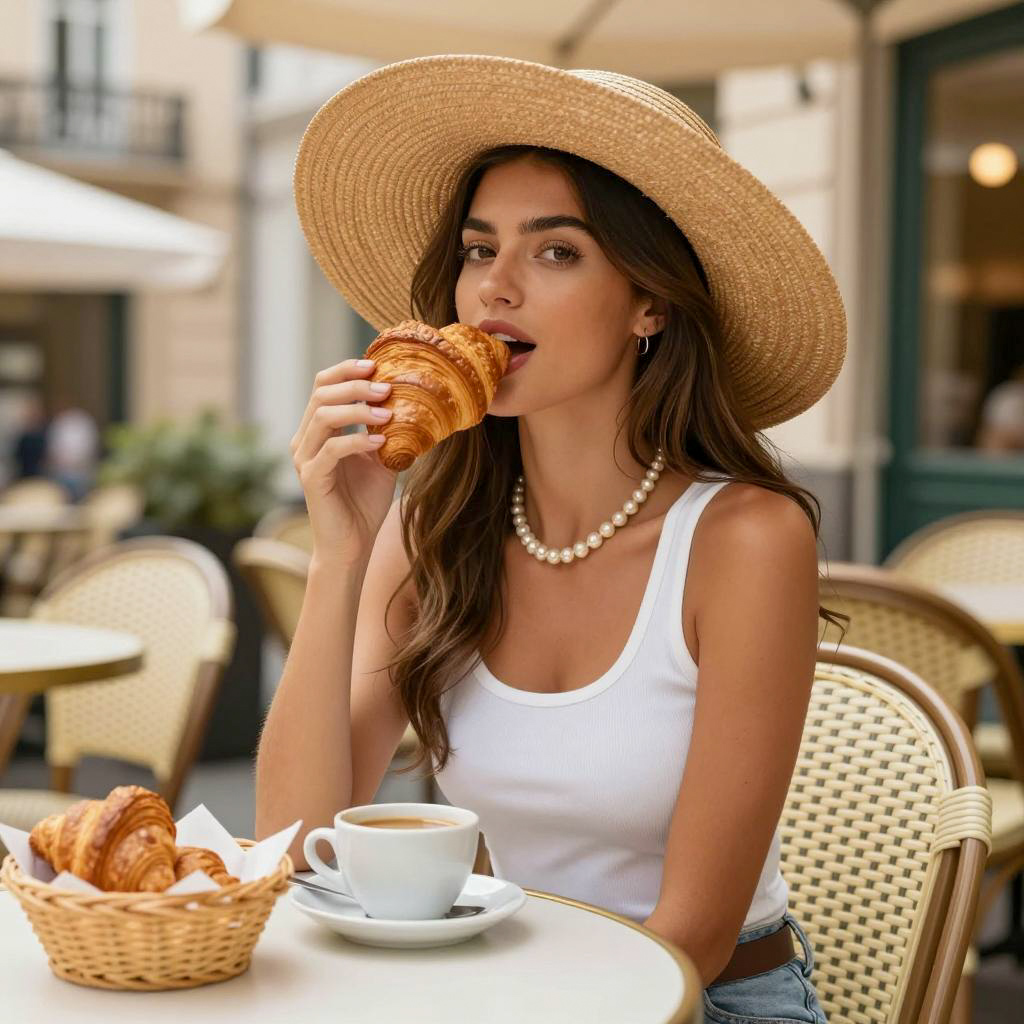 Close-up of a woman wearing a white fur-trimmed coat holding a croissant in front of her face. She has black nail polish and a silver ring on her fingers. In her other hand, she holds a white paper with a gold leaf design. The background shows a blurred street with historic European-style buildings during the daytime.