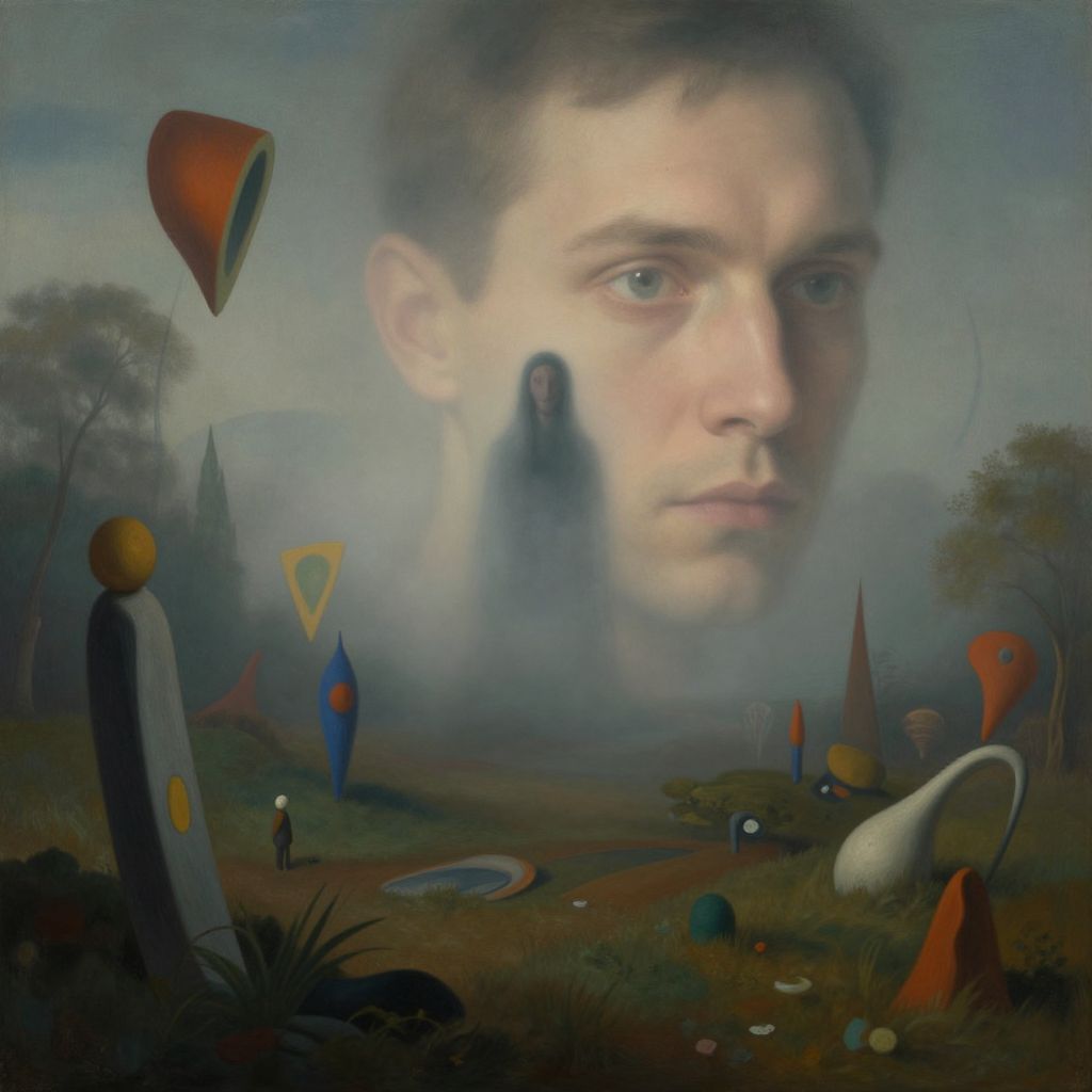 [[man,surrealism photos]]Intricate details of surrealistic landscape, soft focus, ethereal ambiance, moody lighting, misty veil, dreamlike elements: floating objects, distorted shapes, vibrant colors, eerie silence, mysterious figure, enigmatic gaze, abstract forms blending into the environment, thought-provoking, mind-bending scene. Man has masculine face and piercing eyes