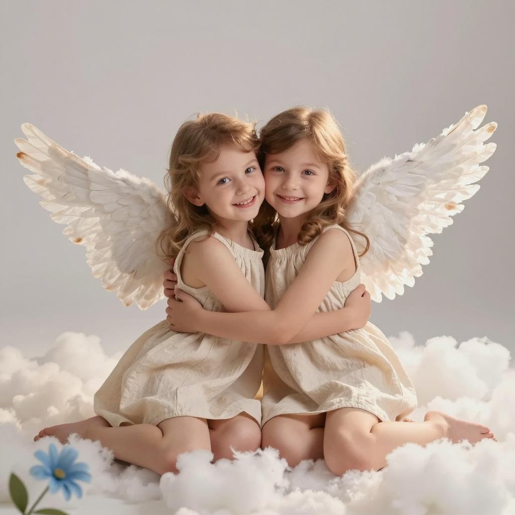 Photorealistic image of a baby boy with medium-length wavy brown hair wearing a white long-sleeve robe adorned with a gold sunburst emblem featuring a face. He has large white feathered angel wings and a serious expression, set against an overcast sky with soft lighting creating an ethereal atmosphere. The detailed textures on the robe and wings emphasize a semi-realistic style in a centered composition.