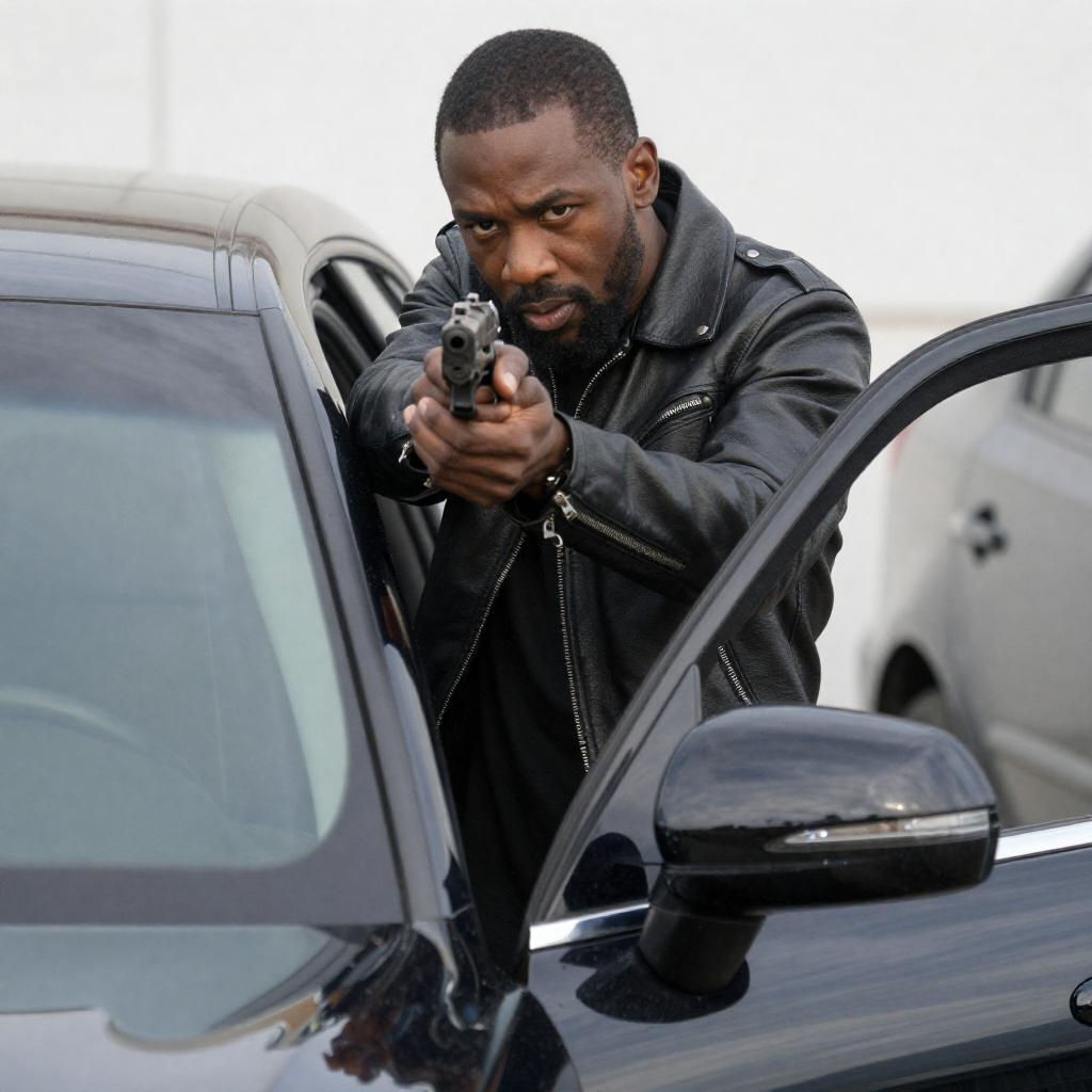 Photograph of two African American men in an urban alleyway. Foreground man, bald with dark skin, intense expression, clenched teeth, blood on cheek, wearing black suit, white shirt, black patterned tie. Background man, with short hair, dark skin, pointing gun forward, wearing black suit, red tie, standing on wooden pallets. Brick building and large metal door in background.