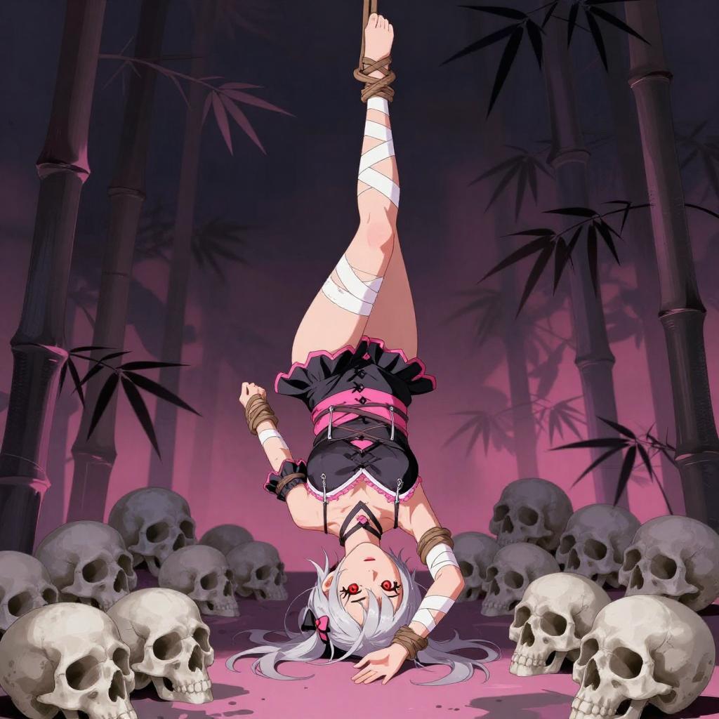 Digital anime-style illustration of a silver-haired woman with red eyes, bound and hanging upside down by her ankle. She wears a black and pink outfit, with white tape on her arm and leg. Surrounding her are numerous white skulls, set against a dark, bamboo-patterned background with pink and purple lighting.