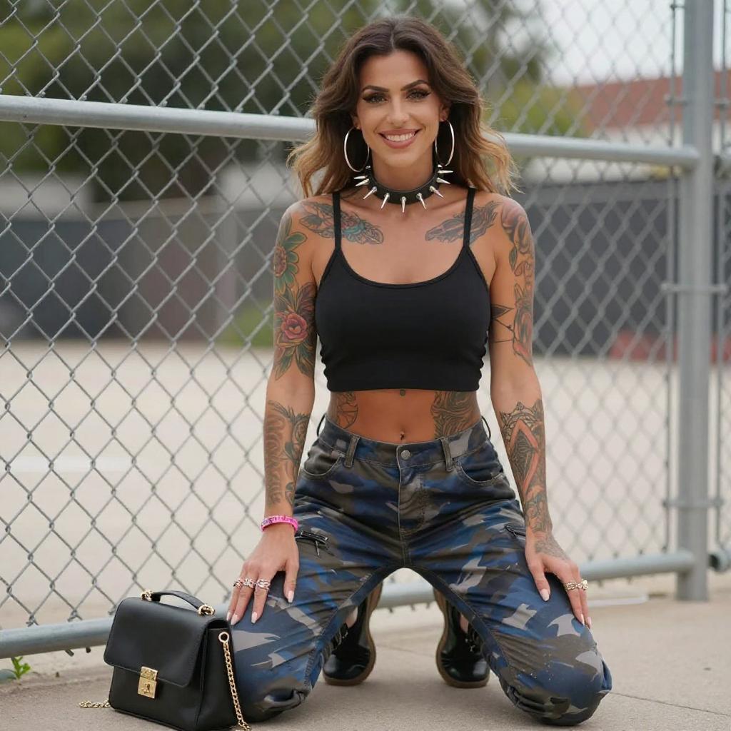 Photograph of a tattooed woman with long black hair, smiling over her shoulder. She wears a black crop top with a pink design, blue jeans with a studded belt, and multiple bracelets. Her right arm is fully tattooed with colorful designs. She stands against a white background, with her hands in her jeans pockets.