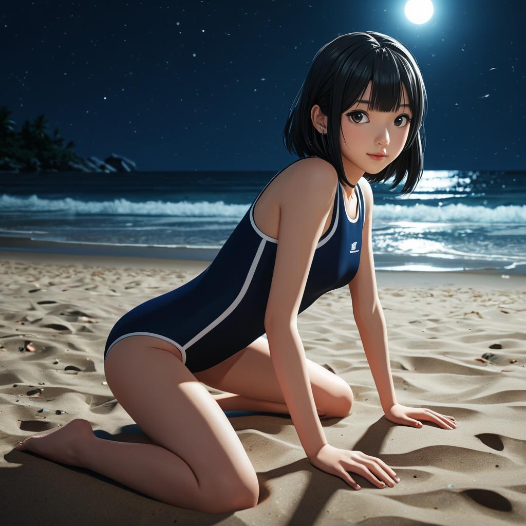 Style: { (masterpiece, (best quality:1.4), highres, 8k resolution, more detailed), anime style, 3D render, figure }; Composition: { at the beach, swim uniform suit, stooping }; Apperiances: { ((1girl)), cute pose. big eyes }; Location: { simple background, night, spotlight