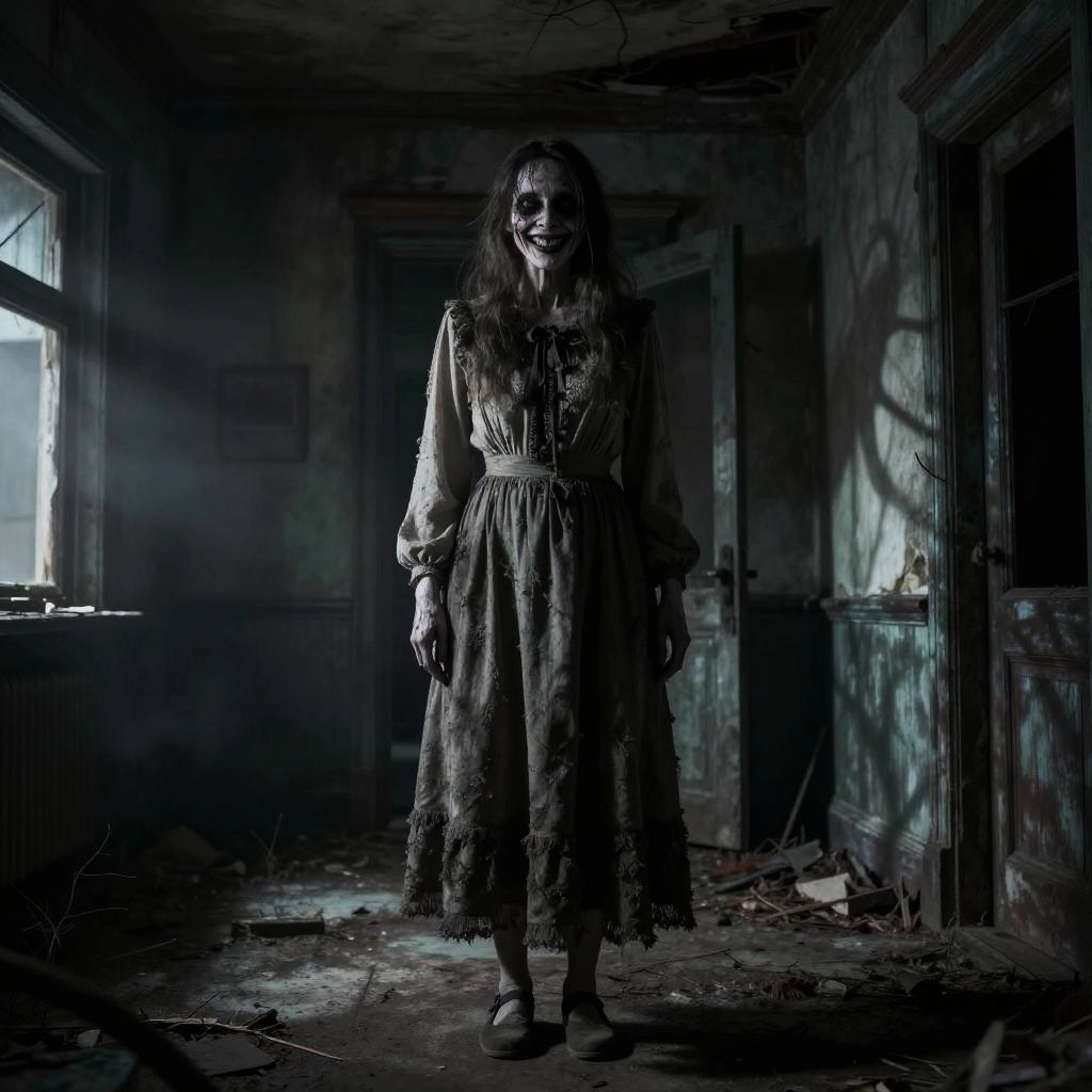 Creepy old lady standing in a dimly lit abandoned house, tattered old dress, eerie smile, twisted shadows, fog surrounding her, hyper-realistic, dark horror atmosphere