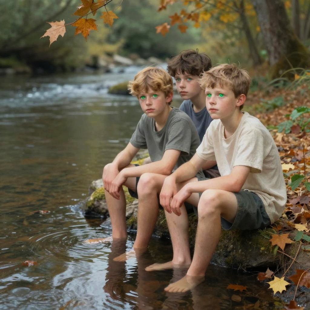 Photograph of three young boys sitting on a moss-covered rock by a gentle stream in a forested area. The boys, with light brown and blonde hair, wear casual gray and white t-shirts and shorts. Their green eyes are digitally enhanced. They are barefoot, with their legs in the water. Autumn leaves, in shades of orange and brown, hang from trees above. The background features a blurred forest with tall trees and a calm stream. The image has a slightly surreal, digitally altered feel, with vivid eye colors standing out against the natural, earthy tones.