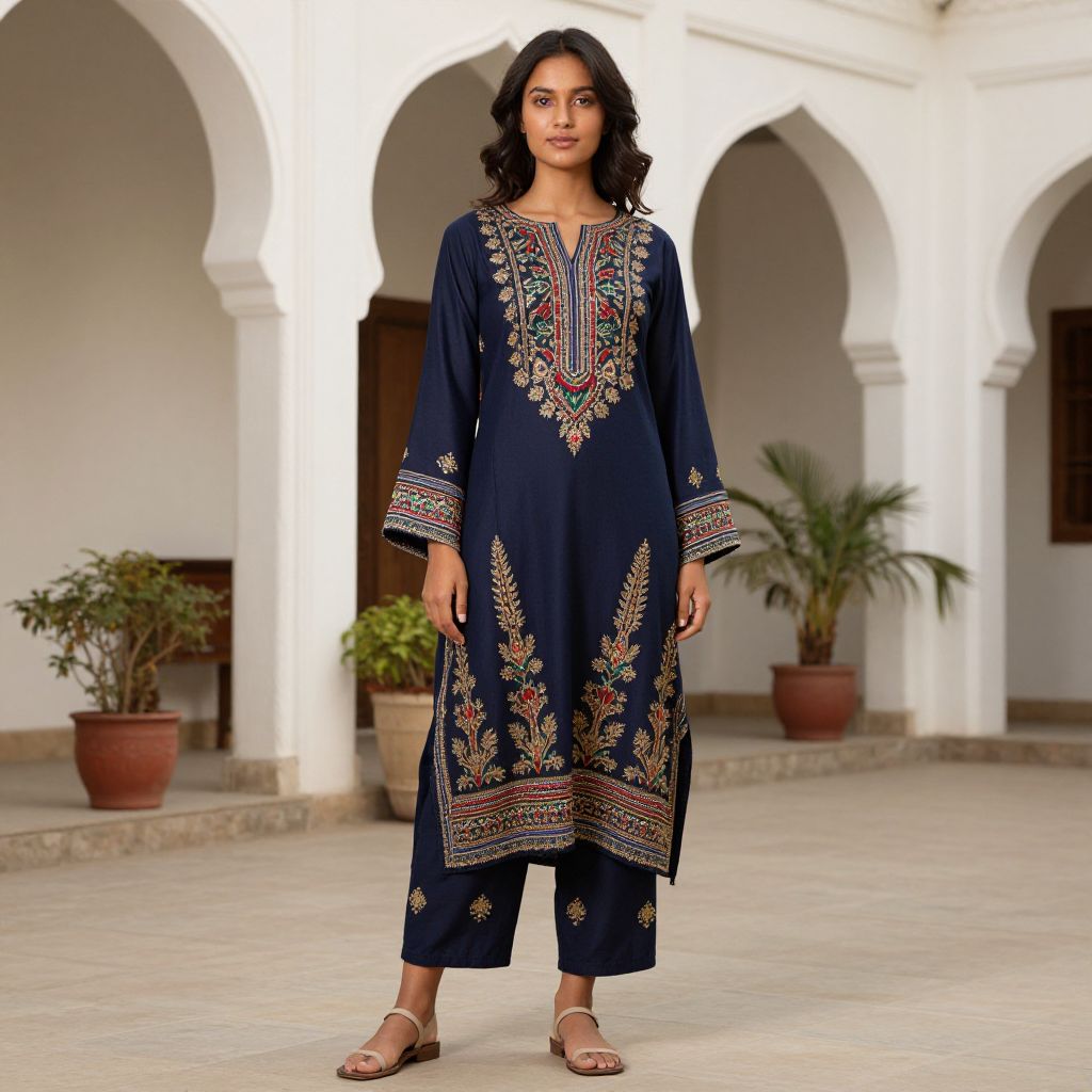 Photograph of a young South Asian woman with medium brown skin and shoulder-length black hair, wearing a long navy blue tunic with intricate multicolored embroidery on the chest, sleeves, and hem. She stands on a tiled courtyard with white arched columns in the background. The tunic is paired with white sandals. Potted plants are visible to her left and right, adding greenery to the scene. The lighting is natural, highlighting the detailed embroidery on her outfit.