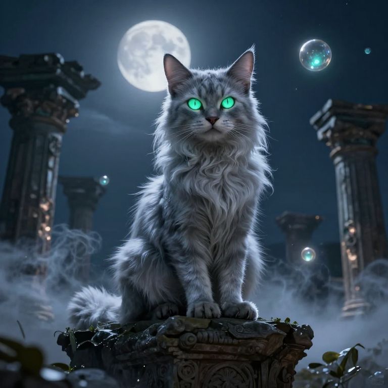 Photorealistic digital artwork of a majestic, long-haired white cat with glowing green eyes, sitting on an ornate, weathered stone pedestal. The cat's fur is fluffy and detailed, contrasting with the dark, mystical background. Behind the cat, there's a large, bright full moon and two floating, glowing orbs. Ancient, crumbling columns frame the scene, shrouded in mist. The night sky is deep blue, adding to the ethereal atmosphere. The cat's intense gaze and luminous eyes create a magical, otherworldly effect.