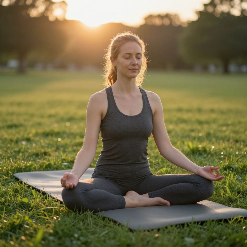 Woman meditating in a serene outdoor setting at sunset, seated cross-legged on a yoga mat amidst lush green grass, with sunlight streaming through her hair and illuminating the tranquil scene.