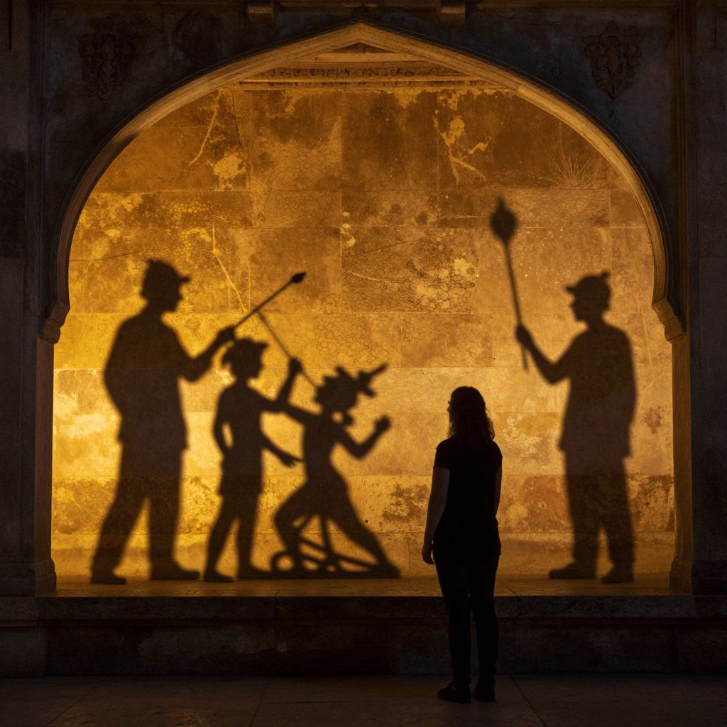 Silhouetted figures cast intricate stories upon golden-lit stone arches as a solitary woman observes the ancient artistry of shadow-painting at dusk.