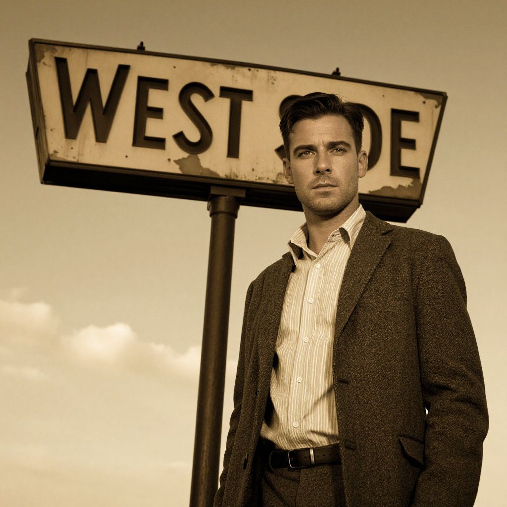 Confident male figure, dressed in classic attire, stands proudly before a weathered vintage West Side sign, set against a warm, golden hour sky with soft clouds, captured in rich sepia tones, exuding nostalgia and timelessness, subtle texture and grain adding depth to the image. Man has masculine face and piercing eyes