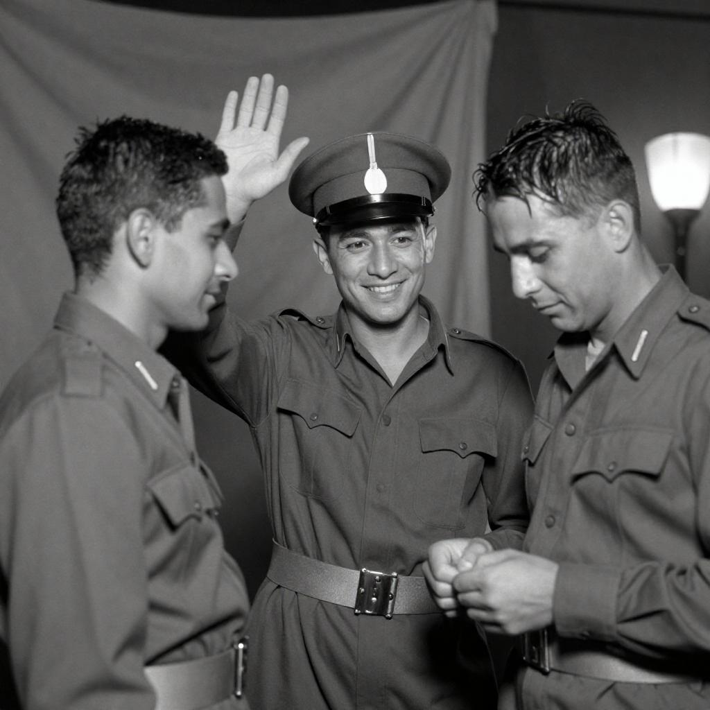 Black-and-white photograph of three men in military-style clothing. Center man with a hat, smiling, raises his right hand. Left man with short dark hair, gazes at him. Right man with wet hair, looks down at his hands. Background has a draped fabric and a lamp on the right. Center man's hat has a white band.