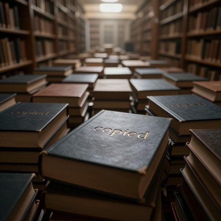 Conceptual image of a library of identical books stacked endlessly, each cover embossed with the word 'copied' in metallic font, in a vast, dimly lit archival room with soft glowing light filtering from above.