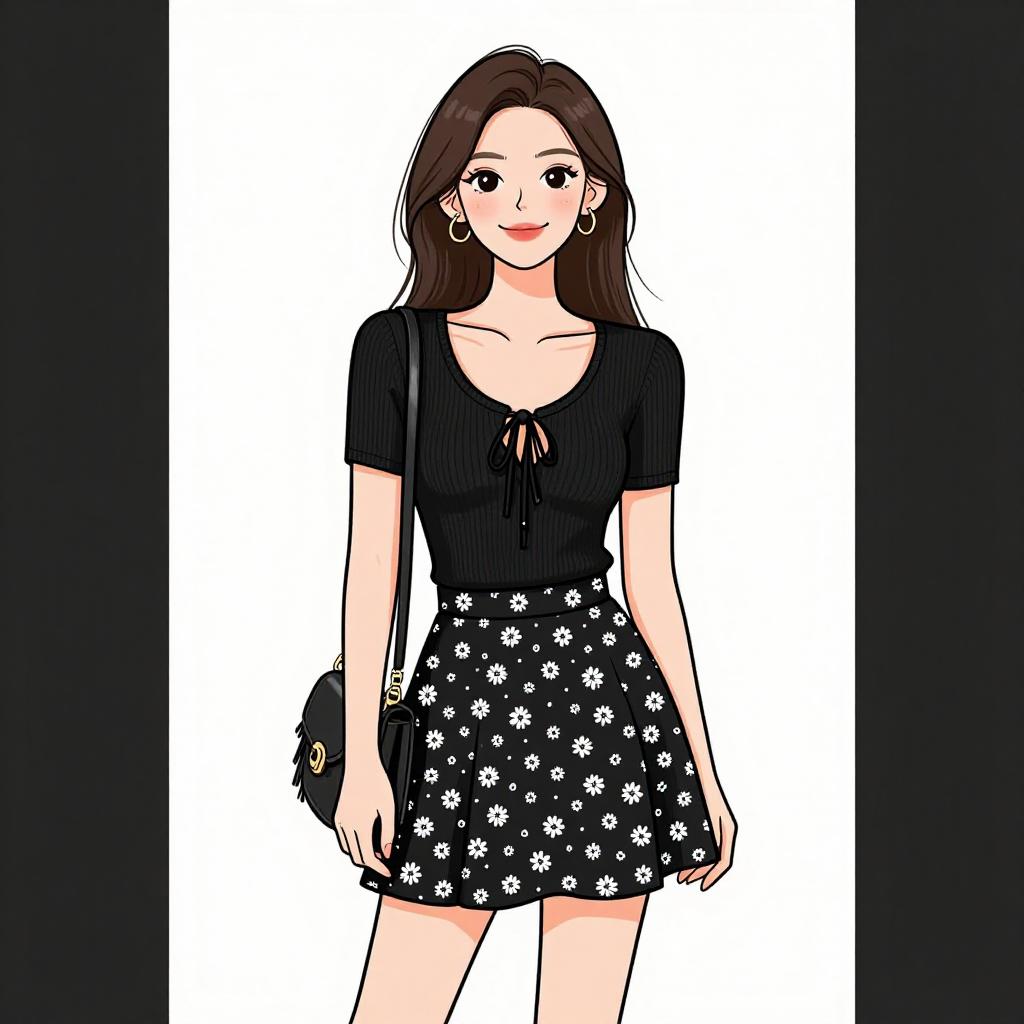 Woman with pretty face and pretty hair. smiling Woman, casual chic, black short-sleeve knit top with front tie-up detail, ribbed texture, scoop neckline, black flared mini skirt with white small floral print, fringe detailed black shoulder bag, white background in a photo studio setting. --sref 1467