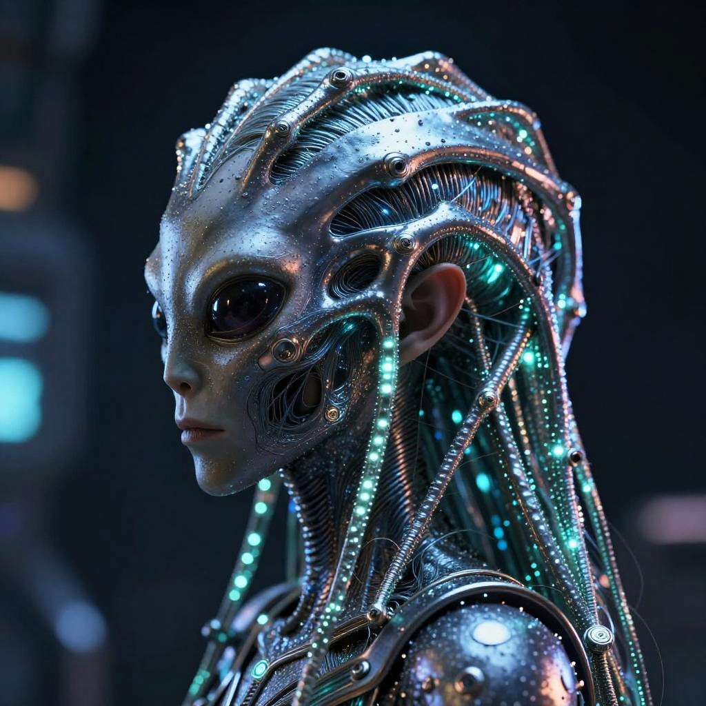 Photorealistic CGI of a futuristic, cybernetic alien with glowing blue and silver circuitry, intricate patterns, and metallic skin, set against a