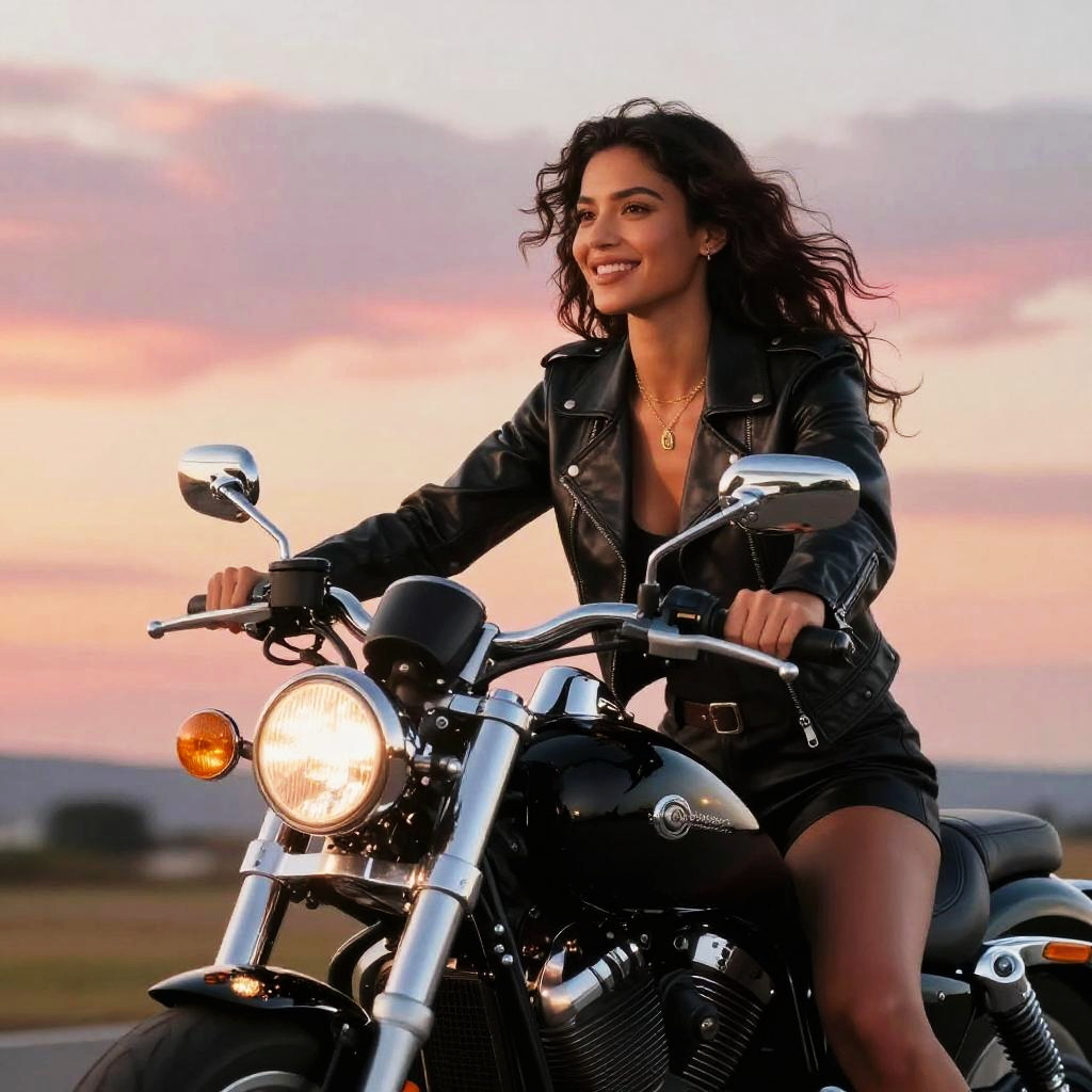 Photograph of a smiling woman with wavy dark hair, wearing a black leather jacket and shorts, riding a black motorcycle at sunset. She has a gold necklace and is holding the handlebars confidently. The background shows a colorful, pink and orange sky with a blurred horizon. The motorcycle has a bright headlight and shiny chrome details.
