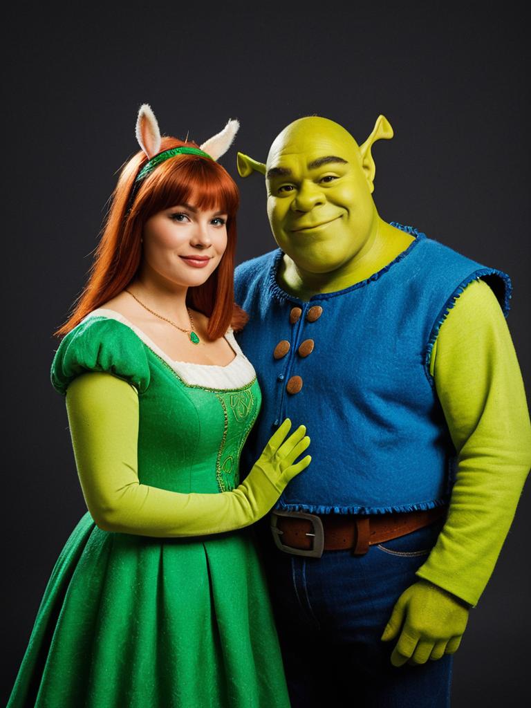Couple in Shrek and Fiona Costume, photorealistic detailed studio portrait