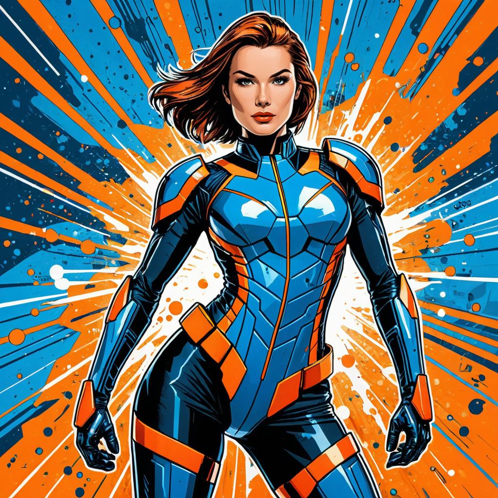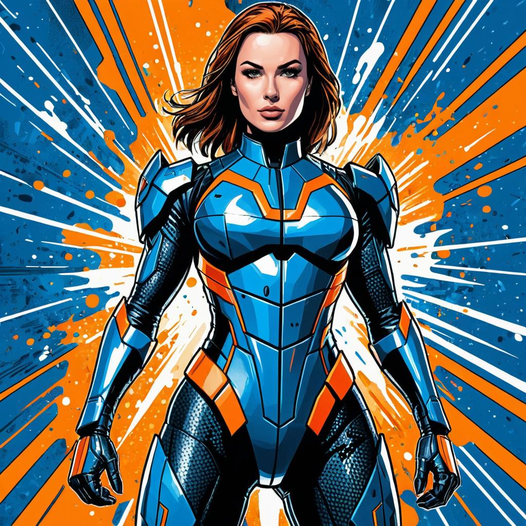 Comic book style illustration of a confident woman wearing a futuristic, form-fitting blue and orange armored suit. She stands in a powerful pose against an abstract background featuring dynamic splashes of orange and blue with bold lines and vivid contrasting colors.