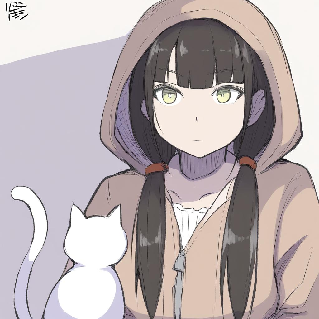 Asakura karen (heaven burns red), heaven burns red, 1girl, cat tail, yellow eyes, long hair, black hair, brown hair, low twintails, blunt bangs, hooded jacket, hood up, white cat, by artist hadashi no kenji, leet