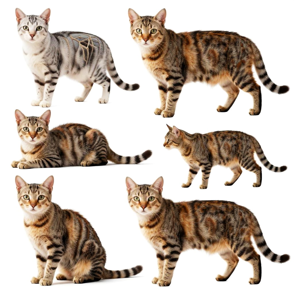 Cat body reference, multiple angles of a cat's body in natural colors, focus on bone structure and muscle definition, realistic fur shading, digital art, for artist use