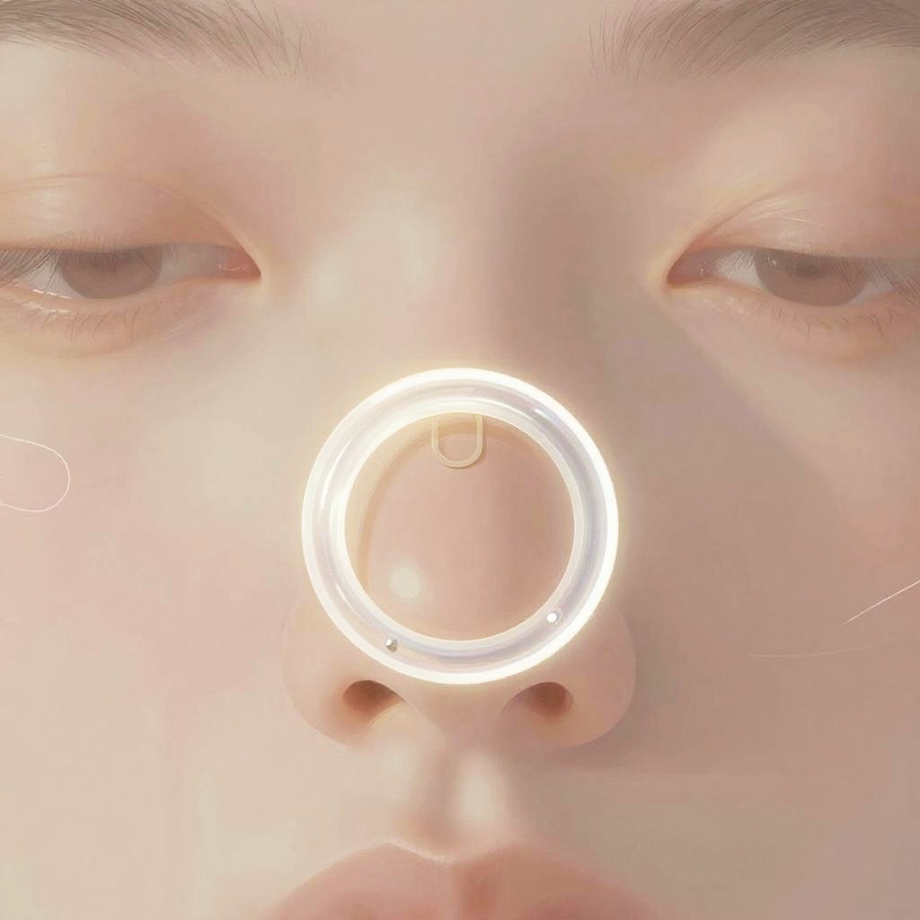 Artistic depiction of a nose ring filter effect, semi-transparent glowing ring around the nostril on a minimalist face, abstract shapes and light trails, surreal and ethereal atmosphere, soft shadows and highlights, digital illustration