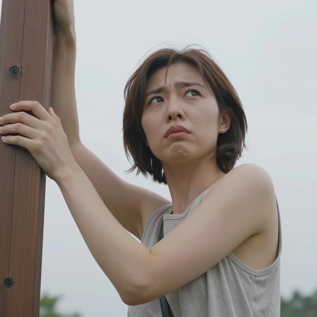 Close-up of a woman with long dark hair, shaved head, and a bruise on her cheek. She holds a drill in her right hand, raised above her head. She wears a dirty white shirt. Her expression is intense and focused. Background is blurred.