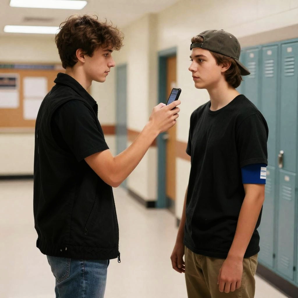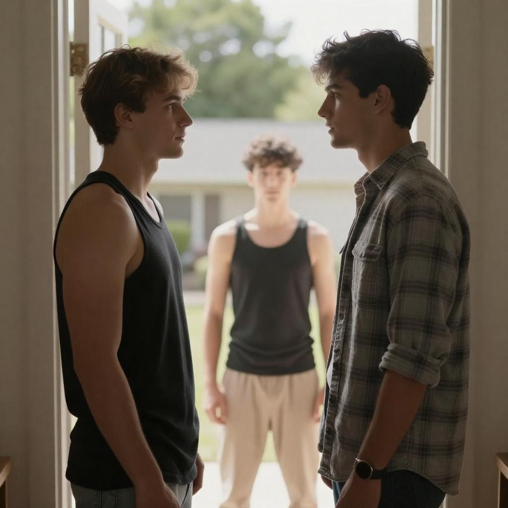 Photograph of a school hallway. Shirtless blonde boy with light skin stands facing a curly-haired, muscular man in a white shirt and blue plaid tie. Man adjusts tie, intense gaze. Blue lockers in background, green exit sign above. Another person, partially visible, in background.